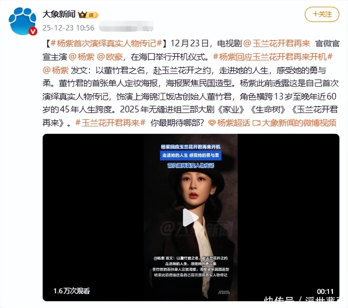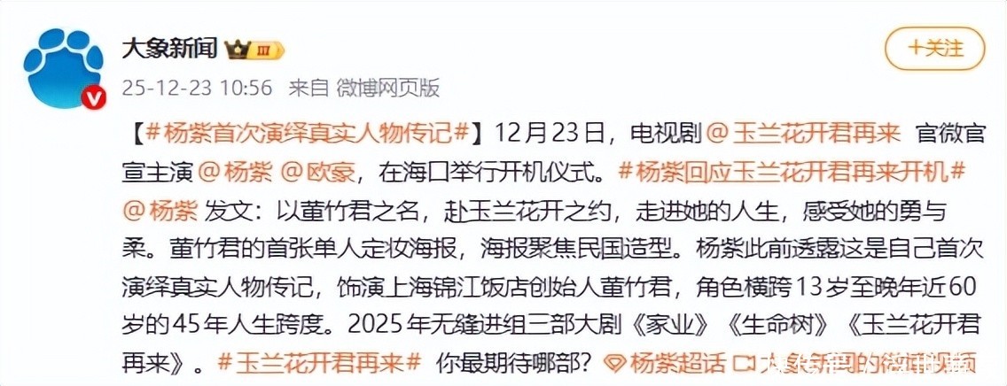 1. 前脚刚与杨幂合作《生万物》引发热议,紧接着便官宣携手杨紫出演新剧。