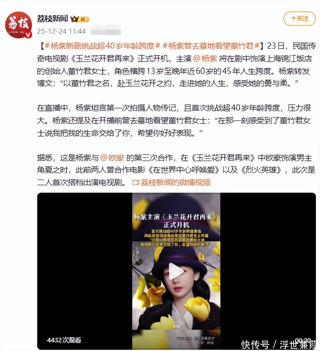 62. 杨紫与欧豪即将三度联手,共同主演年代大剧《玉兰花开君再来》。