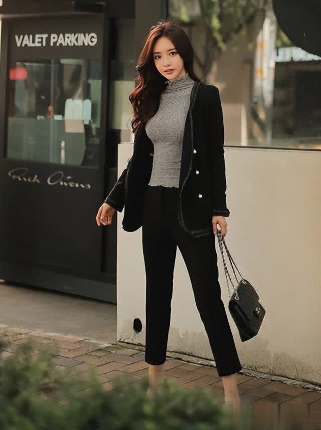 看腻了黑白,我们将黑转成带着灰调的黑色,将单纯的白也变成带着米调的奶白,上身的硬板感就会比经典的黑白要小很多,甚至多了活力感和气质美,是非常有层次感、品味的配色方案。